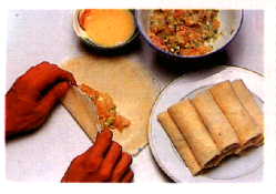 Les rouleaux de printemps sont de petites crèpes de riz farcies. La farce dépend des ingrédients disponibles, des tendances de la cuisinière, etc. En somme, on peut mettre ce que l'on veut, du plus simple au plus élaboré. Dans cette optique, nous vous donnons une version très élaborée qui vous permettra de confectionner vos propres rouleaux en choisissant ce que vous aimez et les ingrédients que vous avez sous la main. L'huile de sésame pour faire revenir les ingrédients de la farce n'est pas indispensable mais elle sert à parfumer et elle est recommandée. Par contre, à cause de son goût prononcé on l'utilise en petite quantité et on augmente la quantité d'huile requise par de l'huile de noix ou une huile végétale moins dispendieuse. La sauce différera sera la touche régionale: