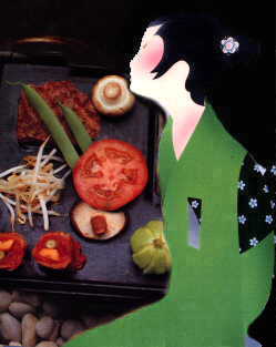 Le terme "shabu" est dérivé du bruissement que font les baguettes qui s'agitent dans le bouillon. C'est le plat des réunions populaires comme pour la fondue européenne. Tous les ingrédients sont disposés sur un grand plateau. Avec les baguettes, on choisit ce que l'on veut prendre et on le plonge quelques secondes dans le bouillon chaud. On le trempe ensuite dans une sauce bien relevée avant de le manger. Au Japon, on utilise habituellement un plat mongol spécifique mais on peut utiliser à défaut, un wok électrique ou un caquelon à fondue. Contrairement aux autres services japonais, ici on ne présente pas un petit bol de riz à côté. On attend d'avoir mangé toute la viande et les légumes et on plonge ensuite dans le bouillon des nouilles. On verse ensuite les nouilles et le bouillon dans de petits bols pour chaque convive. |