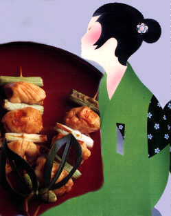 Ce sont les brochettes traditionnelles japonaises servies, sans prétention, dans les estaminets. Yakitori signifie littéralement "poulet grillé". Puisque chaque ingrédient est coupé petit, le temps de cuisson est très court. Vérifier car si on laisse trop longtemps, la viande durcit. Le sansho et le 7-épices sont des condiments que l'on dépose sur la table et chaque convive assaisonne à son goût. On peut servir les yakitori sans les épices. Un bol de riz blanc est servi à part ainsi qu'une petite assiette dans laquelle on verse individuellement un peu de sauce. On peut aussi cuire le poulet à la poêle en Teriyaki en suivant le même procédé que pour le boeuf Ingrédients 4 personnes