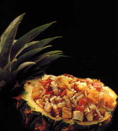 Très décoratif, ce plat peut être présenté dans un gros ananas farci pour 2 - 4 personnes ou de petits ananas individuels ou un ananas moyen coupé en deux. Décorer de tranches de concombres, de feuilles de coriandre, de lamelles de poivrons rouges. Temps de préparation: 10 min. |